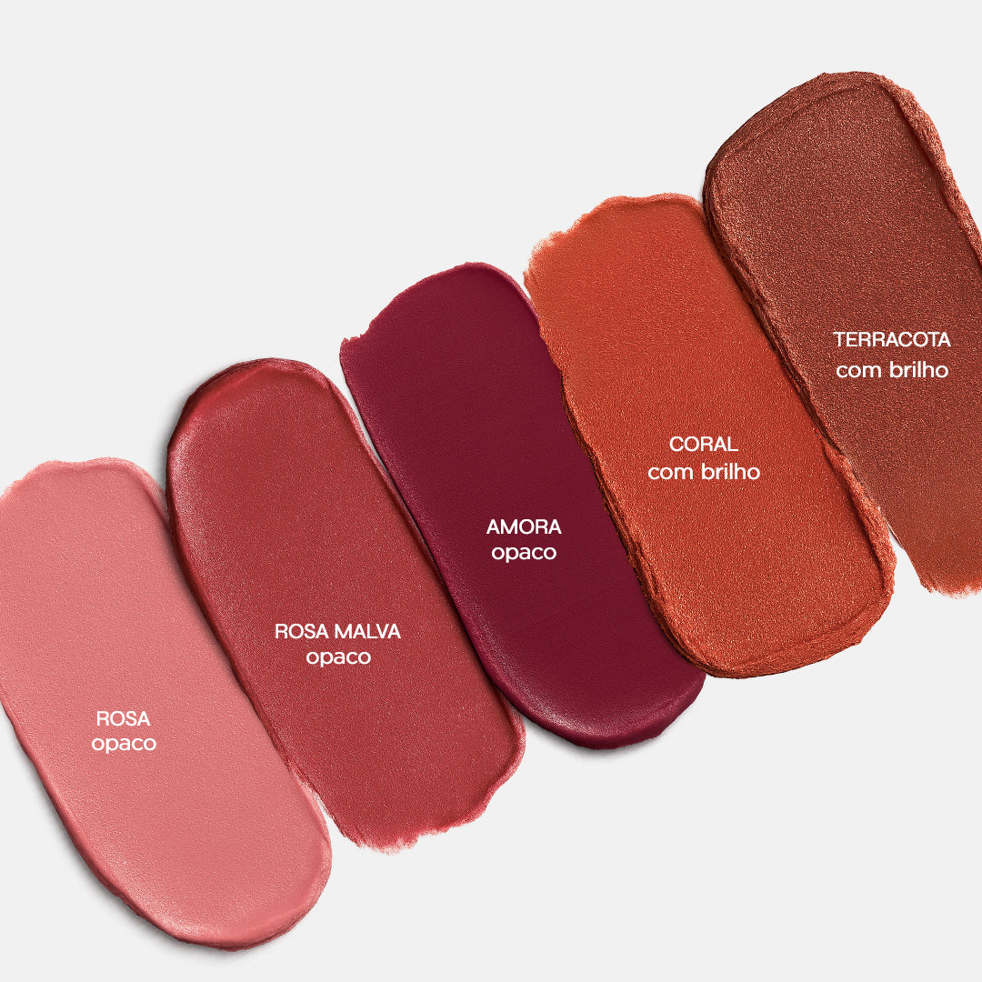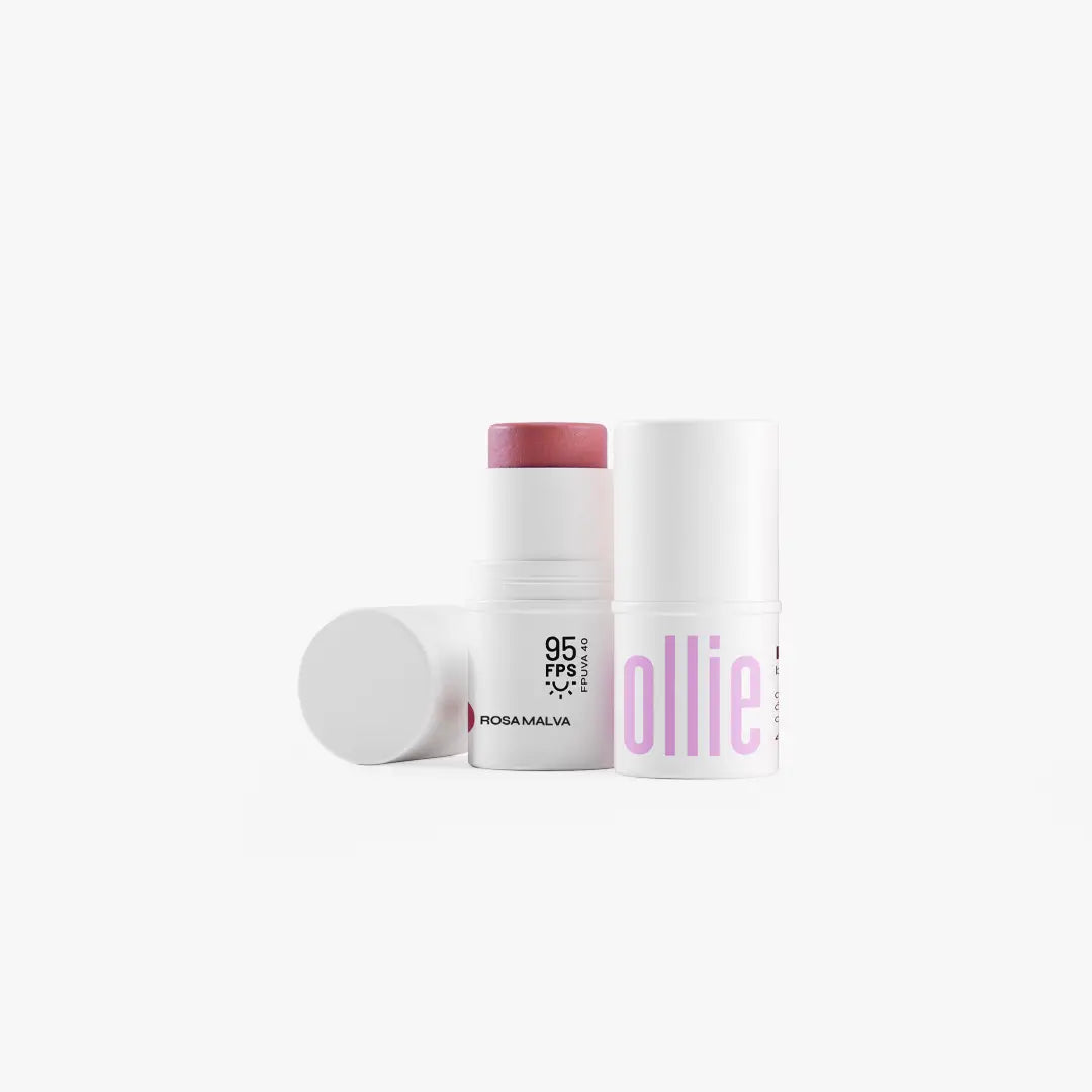 Nosso Ollie em Bastão 3 em 1 FPS 95 é multifuncional e pode ser usado como blush, batom e sombra. Está disponível em 5 cores, sendo2 com brilho – Terracota e Coral e 3 opacas – Rosa, Rosamalva e Amora.